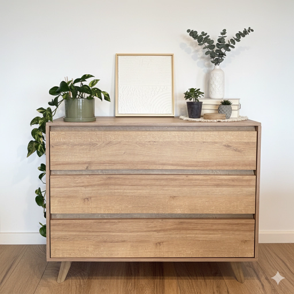CAJONERA DE DISEÑO ESCANDINAVO CON LÍNEAS SIMPLES Y FUNCIONALES. CUENTA CON 3 CAJONES EQUIPADOS CON SISTEMA DE CORREDERAS METÁLICAS QUE GARANTIZAN UNA APERTURA SUAVE Y DURADERA. SU ESTRUCTURA ESTÁ FABRICADA EN MDF COLOR ROBLE MIEL Y SE COMPLETA CON PATAS ESTILO ESCANDINAVO QUE APORTAN ELEGANCIA Y ESTABILIDAD. IDEAL PARA DORMITORIOS, VESTIDORES O ESPACIOS DE GUARDADO.